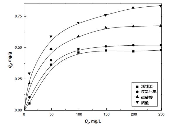 用活性炭和改性活性炭進(jìn)行平衡吸附實(shí)驗(yàn),以評(píng)估它們使用合成的鎳廢水從水性介質(zhì)中除去二價(jià)鎳的能力。通過用0.1g活性炭與50mL濃度范圍為10mg/L至250mg/L的Ni(II)溶液平衡進(jìn)行實(shí)驗(yàn),結(jié)果顯示在圖2中。活性炭的每克吸附容量值按以下順序增加:活性炭>過氧化氫>硫酸銨>濃硝酸。氧化活性炭的容量增加是由于存在大量酸性基團(tuán),其可以與水溶液中存在的陽離子鎳交換它們的質(zhì)子。
