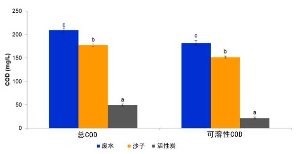 圖2:通過砂濾器和活性炭吸附柱系統(tǒng)處理經(jīng)過生物處理的含殺菌劑的流出物時(shí)的總COD濃度和可溶性COD濃度。對于每個(gè)測量參數(shù),由相同字母指定的條形在5%的水平上沒有顯著差異。