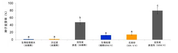 圖3:經(jīng)生物處理的含殺菌劑流出物(未稀釋或稀釋50%)在通過砂濾器和活性炭吸附柱系統(tǒng)處理前后的發(fā)芽指數(shù)(GI)值。由相同字母指定的條形在5%的水平上沒有統(tǒng)計(jì)差異。