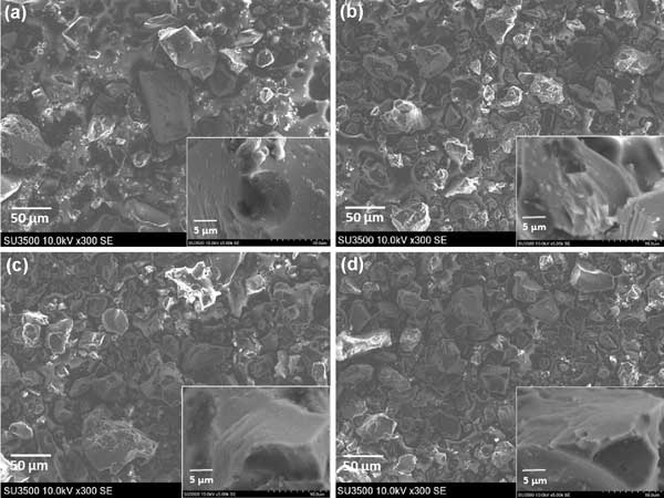 我們通過掃描電子顯微鏡研究了炭化料和活性炭的形態(tài)。如圖1,炭化料形態(tài)顯示與晶粒尺寸的變化,并用直徑約為26.25微米的大的孔隙率。然而,活性炭的顆粒(圖1b-d)變得更小且均勻,平均直徑約為22μm。通過進(jìn)一步增加放大,可以觀察碳和活性炭的表面。碳上的化學(xué)和物理活化過程顯示出相似的形態(tài),沒有觀察到顯著的變化或結(jié)構(gòu)扭曲。炭化料樣品顯示出光滑的表面和一系列貫穿表面的條紋,而活性炭表面看起來光滑,帶有小碎片和越來越多的條紋。在高溫過程中,炭化料被活化成導(dǎo)電的活性炭,伴隨著氣態(tài)副產(chǎn)物如CH4、H2、CO和CO2的釋放;罨^程產(chǎn)生表面反應(yīng),這有利于活性炭多孔結(jié)構(gòu)的形成。