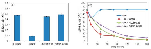 圖2:(a)溴酸鹽和(b)過氧化氫被不同類型的活性炭去除。