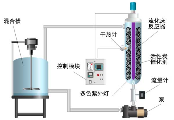 圖1:中試規(guī)模的流化床光反應(yīng)器示意圖,用于從工業(yè)廢水中去除苯胺和苯并噻唑的光催化和吸附實(shí)驗(yàn)。