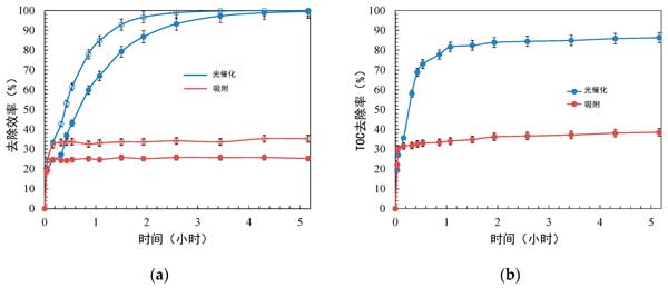 圖3:活性炭催化劑的吸附和光催化過程的去除效率。(a)初級降解,(b)礦化。