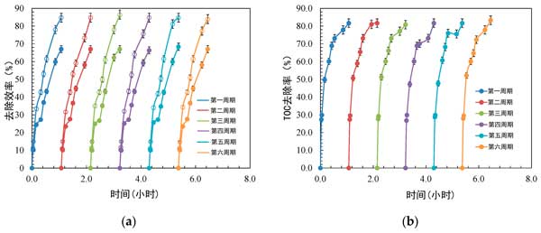 圖4:使用活性炭催化劑在六個重復(fù)循環(huán)內(nèi)對苯胺和苯并噻唑進(jìn)行光催化降解的可重復(fù)使用性測試。(a)苯胺和苯并噻唑的初級降解(b)礦化。