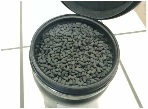 根據(jù)直接使用瓶裝真實(shí)氣體所獲得的結(jié)果,包括列出的催化劑毒物,這會(huì)導(dǎo)致催化劑快速降解,因此在第一個(gè)反應(yīng)器的上游安裝了活性炭過(guò)濾器。為此,將金屬氧化物浸漬的活性炭顆粒添加到氣體混合站。這些顆粒專門開(kāi)發(fā)用于從缺氧氣流(例如CO2、N2、CO和H2)中去除硫化氫、有機(jī)硫醇、二氧化硫、硫化羰和氮氧化物。它們的銅含量為7%(以CuO計(jì)),直徑為3mm,長(zhǎng)度為7mm(圖3)。將總共約300毫升的這些顆粒活性炭加入氣體混合站。