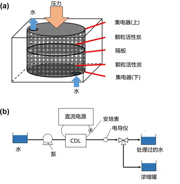 圖1:(a)使用活性炭作為電極的CDI電池的結構和(b)單程模式下CDI設備的示意圖。