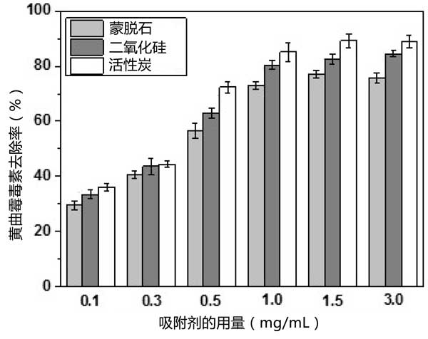 三種吸附劑對(duì)AFB1的吸附在25℃下進(jìn)行24小時(shí)。圖1顯示了活性炭和其它吸附劑用量的AFB1去除率。無(wú)論吸附劑劑量如何,使用活性炭時(shí)去除率更高,其次是二氧化硅和天然蒙脫石。正如預(yù)期的那樣,AFB1的去除率隨著吸附劑劑量的增加而增加,這可以通過(guò)AFB1與吸附劑之間的相互作用增加來(lái)解釋,包括氫鍵、孔填充和靜電吸引力。吸附劑量為1.0mg/mL時(shí),黃曲霉毒素的去除率使用蒙脫石、二氧化硅和活性炭時(shí),分別為73.23%、80.35%和85.09%。在較高的吸附劑量(1.5mg/mL)下,去除率分別略微增加至75.56%、83.48%和89.15%。在這個(gè)吸附系統(tǒng)中,當(dāng)吸附劑以較低濃度使用時(shí),可用的吸附位點(diǎn)較少。因此,增加吸附劑濃度有效地增加了吸附位點(diǎn)的數(shù)量,從而提高了AFB1的去除率。但濃度過(guò)高時(shí),吸附劑顆粒間會(huì)發(fā)生膠結(jié)、絮凝和團(tuán)聚現(xiàn)象。這導(dǎo)致可用吸附位點(diǎn)的數(shù)量穩(wěn)定或減少,并且去除率沒(méi)有進(jìn)一步提高。此外,當(dāng)吸收劑以高濃度使用時(shí),可能會(huì)消除維生素E和甾醇等微量營(yíng)養(yǎng)素,從而導(dǎo)致?tīng)I(yíng)養(yǎng)流失。因此,使用濃度為1.0mg/mL的吸附劑被認(rèn)為是合適的,因此在進(jìn)一步的實(shí)驗(yàn)中被采用。