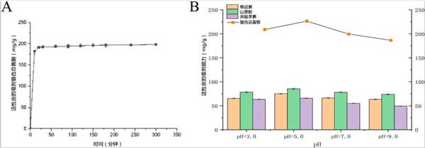 圖1:銀杏葉中銀杏總黃酮的靜態(tài)吸附曲線(A)和pH對活性炭靜態(tài)吸附的影響(B)。