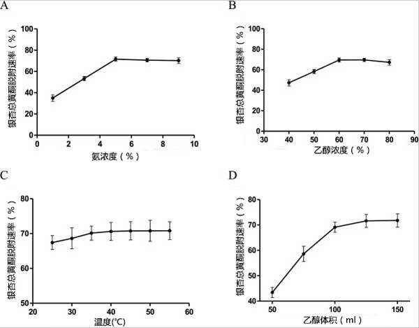 活性炭對銀杏葉中銀杏總黃酮的吸附主要依靠分子間范德華力的可逆吸附和表面酸性氧化物的不可逆吸附,兩者在吸附極性化合物方面均優(yōu)于非極性化合物。銀杏總黃酮的解吸方法主要有升溫解吸(沸水)、置換解吸(苯酚、氨水或CaCl2)和超聲波解吸。沸水對銀杏總黃酮的穩(wěn)定性影響很大,氨水的效果與幾種去污劑相比效果顯著。因此,本研究將通過單因素優(yōu)化相關(guān)因素。單因素優(yōu)化比較了三種拆分劑(苯酚、氨水或CaCl2)對活性炭中銀杏總黃酮拆分的影響,其中氨水的影響最為顯著。因此,我們比較了不同濃度氨對活性炭解析的洗脫速率,氨濃度在5%時達到最大值,超過5%后逐漸下降。由于黃酮類化合物的極性范圍較寬,在大約5%的氨-乙醇-水溶液中可以實現(xiàn)銀杏總黃酮的最大解吸率(71.2%)。