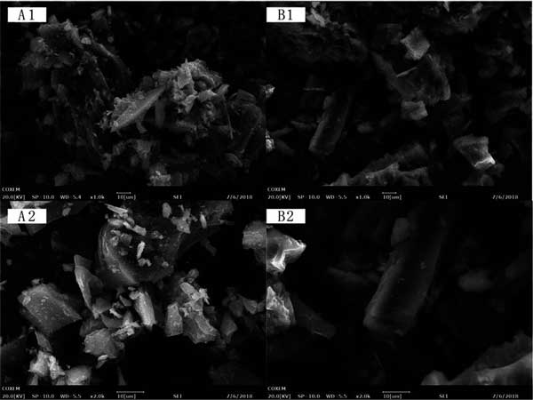 圖3:被活性炭吸附和解吸的銀杏總黃酮的SEM。A1和A2是洗脫前不同放大倍數(shù)的SEM照片。B1和B2為洗脫后不同倍率的SEM照片。
