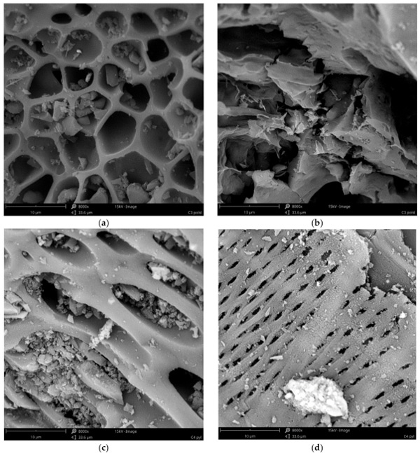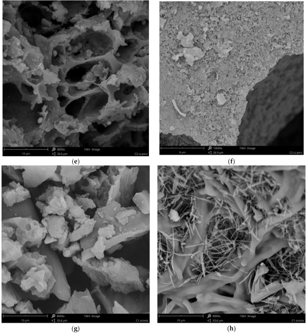 在溶劑加載之前的活性炭通過使用掃描電子顯微鏡作為SEM顯微照片進(jìn)行表征(圖1)。分析表明,不僅研究不同材質(zhì)活性炭彼此的不同,而且在一種材料中也可能出現(xiàn)不同的結(jié)構(gòu)(圖1a與圖1b、圖1c與圖1d、圖1e與圖1f和圖1g與圖1h)。所有的材料都不是均質(zhì)的,在所有的原材料中,都可以發(fā)現(xiàn)具有不同孔隙率的顆粒、壓實的塊狀,甚至是纖維結(jié)構(gòu)。材料C1(粒徑0.5÷0.75mm的活性炭)是高度多孔的,顆粒充滿可見孔,直徑為5÷11µm,壁光滑(圖1a),顆粒結(jié)構(gòu)的壁密度較低,但也有很大的表面積(圖1b)。粉狀活性炭(C2)具有較小的(圖1d)和較大的(圖1c)孔,具有光滑(圖1c)和較粗糙(圖1d)的壁和細(xì)長的形狀。這兩種材料似乎都具有良好的孔隙率和表面,因此它們應(yīng)該是非常有效的吸附劑。我們的結(jié)果證實,C1和C2在鉭的去除方面都非常有效,去除效率約為97%。C3的多孔性要小得多。雖然有一些顆粒具有相對較高的孔隙(圖1e),但也有較高含量的更致密、相當(dāng)無孔的塊狀(圖1f)?紫督Y(jié)構(gòu)受到輕微干擾,可能是由植物材料中可能存在的無機(jī)化合物晶體造成的(圖1e)。因此,這種結(jié)構(gòu)表明較低的表面和吸附特性。然而,無孔件的表面積似乎很發(fā)達(dá)(圖1f)。這是相當(dāng)虛幻的,因為在使用的所有活性炭中,材料C3的鉭去除效率最低(81%)。最小的大孔材料似乎是C4炭。它由具有緊湊結(jié)構(gòu)的塊(圖1g)和類似于納米管或纖維結(jié)構(gòu)的形式(圖1h)組成。這種材料的多孔性也比C1和C2少,但由于纖維的原因,它的表面應(yīng)該比C3更發(fā)達(dá),因此它應(yīng)該具有更好的吸附效率。事實上,這種材料的鉭去除效率略高于C3,但仍低于活性炭C1和C2。根據(jù)這些結(jié)果,可以得出結(jié)論,C1和C2的原材料就具有大孔結(jié)構(gòu)。