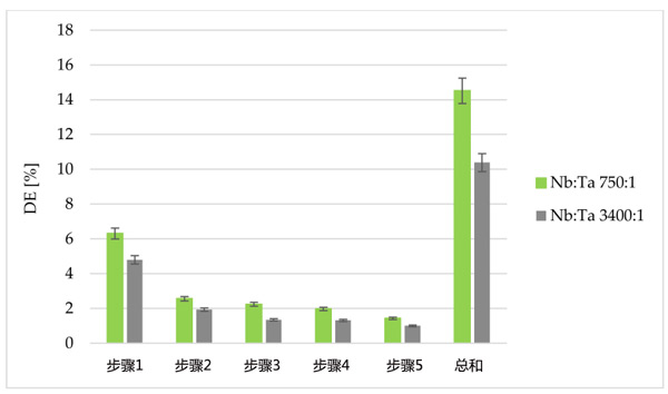 在進(jìn)一步的研究中,檢查了是否可以多次使用相同部分的浸漬活性炭從鉭中提純鈮。為此,以分批模式進(jìn)行解吸研究。使用了兩種不同的剝離劑草酸銨和過氧化氫的溶液(圖3),它們與鉭離子形成穩(wěn)定的絡(luò)合物。解吸過程分五個步驟進(jìn)行,在使用4%草酸銨溶液而不是15%過氧化氫溶液的情況下,解吸效率明顯更高。使用第一汽提劑,可以回收保留在活性炭上約50%的鉭。大部分鉭在第一步和第二步中回收,因此在第五步停止解吸,認(rèn)識到繼續(xù)該過程不會顯著提高所獲得的解吸百分比。解吸效率還受吸附過程中活性炭上保留的鉭量的影響。在批量吸附過程中保留在樹脂上的鉭量的差異是由于使用了具有不同鈮與鉭比率的溶液,同時保持溶液中Nb和Ta離子的可比總濃度。降低活性炭(Nb:Ta=3400:1)上的鉭量會導(dǎo)致解吸效率顯著降低,這可能是由于活性炭結(jié)合了一些鉭離子。
