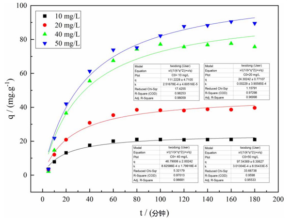 根據(jù)動力學(xué)方程,當(dāng)溫度為25℃且改性活性炭用量為8g/L時,擬一級動力學(xué)和擬二級動力學(xué)分別用于擬合。發(fā)現(xiàn)二階動力學(xué)方程的擬合效果更好,結(jié)果如所示圖2。