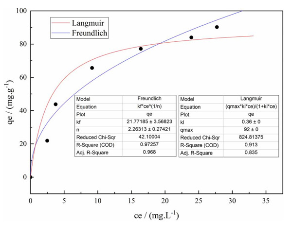 當(dāng)反應(yīng)溫度為25℃,投加量為8g/L時,可獲得不同初始濃度下亞硝基二乙胺的平衡濃度和改性活性炭的平衡吸附容量。使用Langmuir和Freundlich熱力學(xué)方程對數(shù)據(jù)進行擬合,結(jié)果如所示圖3從圖中可以看出,吸附過程不符合Langmuir等溫線方程,F(xiàn)reundlich吸附等溫線方程也適用。當(dāng)初始濃度達到一定值時,吸附趨于平衡并達到飽和。