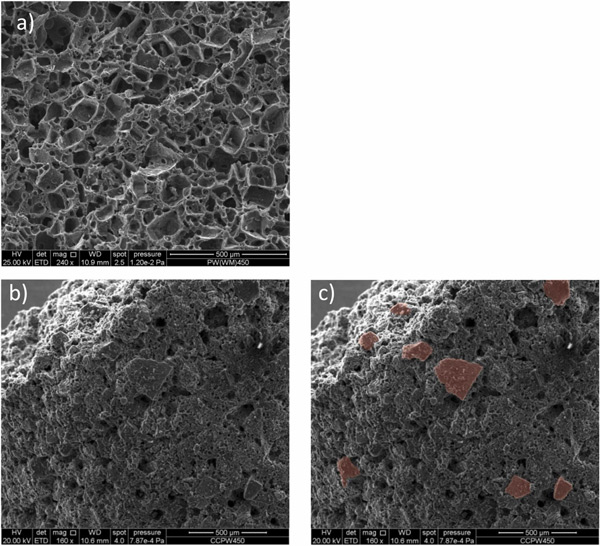 圖3:(a)乳清顆粒在450℃下碳化的SEM顯微照片,(b)柱狀活性炭在450℃下碳化,(c)與(b)相同,但原材料顆粒清晰可見。