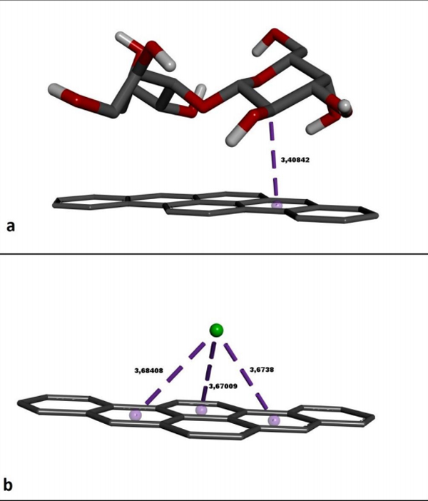 在這項(xiàng)研究中,進(jìn)行了分子對(duì)接以檢查活性炭與乳糖以及離子:鈣的原子間相互作用。如圖2a所示,乳糖分子在其結(jié)構(gòu)中的吡喃半乳糖環(huán)的第三個(gè)碳原子上與活性碳的六角碳環(huán)形成一個(gè)疏水π-σ接觸。雖然這種非鍵合接觸的長(zhǎng)度為3.40Å,但乳糖與活性炭的結(jié)合自由能是有利的。鈣(Ca+2)離子與三個(gè)相鄰的活性炭六角碳環(huán)形成三個(gè)鍵相互作用(圖2b)。