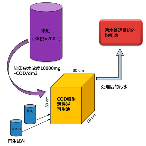 根據(jù)獲得的數(shù)據(jù)和當(dāng)前的紗線染色工藝,使用所提出的兩步處理系統(tǒng)處理來自常用的200L染浴的高COD染色廢水看起來適用,并提出了建議如圖3所示。據(jù)我們所知,目前運(yùn)營的染色設(shè)施中沒有這種建議的設(shè)置。設(shè)計(jì)容積(即200L)足以容納一批染缸出水,使高COD廢水可直接進(jìn)入擬建裝置的吸附和再生。根據(jù)結(jié)果,去除50-60%的COD將大大減少回流到平衡罐的COD,從而避免現(xiàn)有廠內(nèi)生物處理單元的過載情況。為了運(yùn)行所提議的裝置,首先,將來自染色池的一定量的高COD廢水引導(dǎo)至充滿指定活性炭的反應(yīng)單元(如果處理120L廢水,則為20kg)進(jìn)行24小時(shí)吸附。由于結(jié)果表明染浴出水COD在酸性pH值下吸附更多,二是對(duì)處理后的廢水進(jìn)行篩分,24小時(shí)后排至其廢水處理設(shè)施的頭部(即平衡池)。第三,分別串聯(lián)添加初始濃度為2.12mmol/dm3和2.5%的乙二胺四乙酸鐵鈉和過氧化氫,以啟動(dòng)活性炭再生1小時(shí)。從連續(xù)運(yùn)行來看,兩步法處理高COD染色廢水的應(yīng)用前景看好。然而,我們確實(shí)注意到該技術(shù)的當(dāng)前應(yīng)用可能僅限于染浴設(shè)計(jì)及其操作。染浴的高COD流出物發(fā)生在染色過程的第一次排放,但對(duì)于大多數(shù)可用的染浴操作,根據(jù)不同的COD濃度對(duì)每批流出物進(jìn)行分離是不適用的。一些染色裝置或染色工藝的改造被認(rèn)為是必要的。