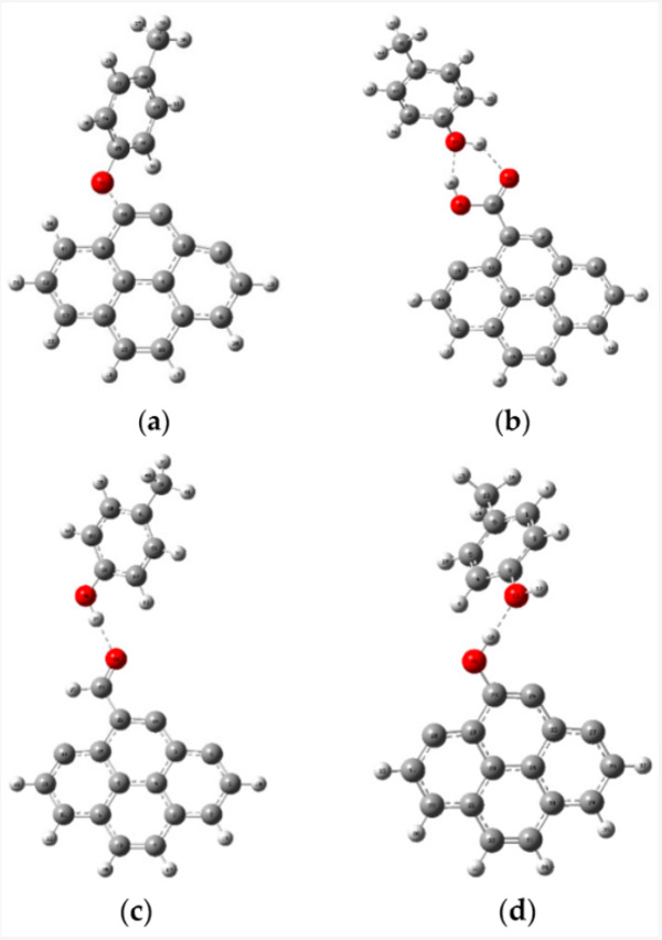 預(yù)計(jì)甲酚在活性炭上的吸附將通過(guò)各種類(lèi)型的相互作用進(jìn)行,例如電子供體-受體機(jī)制、靜電相互作用、π-π相互作用和氫鍵形成。然而,在各種類(lèi)型的相互作用中,活性炭和被吸附物之間的氫鍵是有助于吸附過(guò)程的重要相互作用類(lèi)型之一。因此,在本研究中,使用DFT方法研究了對(duì)甲酚和活性炭之間的氫鍵相互作用。考慮到它們之間的氫鍵,研究了對(duì)甲酚與原始活性炭和功能化活性炭的相互作用。圖1代表各種相互作用的優(yōu)化結(jié)構(gòu)。
