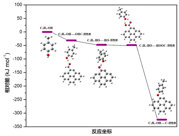 對(duì)對(duì)甲酚分子與原始活性炭、活性炭-COOH、活性炭-OH和活性炭-CHO相互作用的吸附能進(jìn)行了比較研究,以確定甲酚吸附的最佳可能相互作用類(lèi)型。圖2給出了能量分布圖。對(duì)甲酚與原始和功能化活性炭的吸附能顯示出較高的負(fù)能,表明甲酚與原始和功能化活性炭的相互作用是有利的。然而,與功能化活性炭相比,原始活性炭對(duì)甲酚的吸附能更負(fù),表明原始活性炭,即具有高度不飽和度的活性炭,將更有利于甲酚吸附。