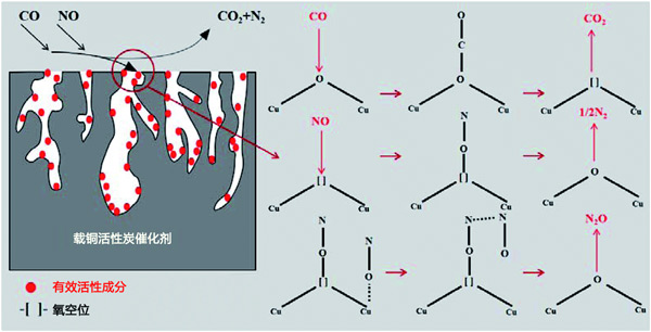 在活性炭催化劑表面通過選擇性催化還原技術(shù)(CO-SCR)反應(yīng)進(jìn)行的低溫脫硝是一種具有代表性的非均相催化體系,遵循Langmuir-Hinshelwood反應(yīng)機(jī)理。因此,提出了圖3所示的脫硝機(jī)制,用于在活性炭催化劑上對(duì)NO進(jìn)行CO還原;钚越M分Cu均勻分散在活性炭上,增加了催化劑的比表面積和對(duì)NO和CO的吸附。這一結(jié)論表明Cu均勻分布在活性炭催化劑的表面,將脫硝效率提高到80%。CO吸附在催化劑表面以還原-O-Cu2+到=Cu+并生成CO2。吸附的NO解離成N和O,解離的N原子與NO分子結(jié)合形成N2O。據(jù)報(bào)道,NO的解離是CO誘導(dǎo)的NO消除的關(guān)鍵步驟;钚晕稽c(diǎn)的釋放促進(jìn)了CO的吸附,最后N2O和=Cu+反應(yīng)生成N2和–O–Cu2+,這進(jìn)一步促進(jìn)了脫硝反應(yīng)。在CO與NO的反應(yīng)中,Cu2+↔Cu+交換可能會(huì)改變催化劑表面的價(jià)態(tài),更多的氧空位可用于轉(zhuǎn)化過程,促進(jìn)NO向N2的轉(zhuǎn)化。
