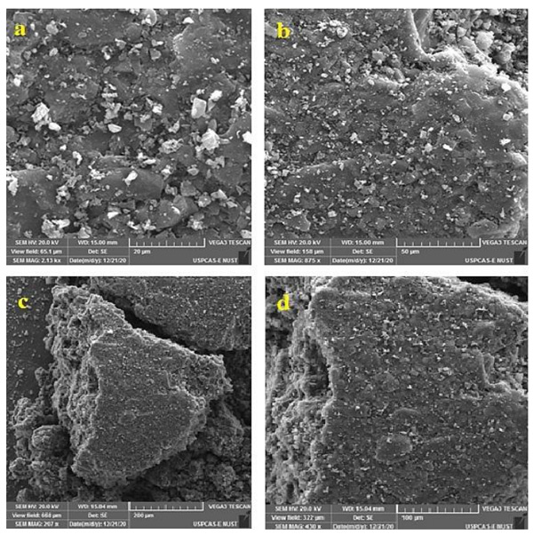 圖2:(a,b)純活性炭和(c,d)改性活性炭的SEM顯微照片。