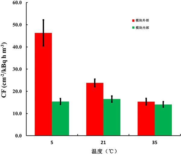 對于實驗,使用三種活性炭的織物為探測器設(shè)計了單獨(dú)的模塊。對于前兩種活性炭,模塊是HDPE,對于第三種活性炭,模塊是LDPE。單獨(dú)設(shè)計遵循上述方法,考慮到每種活性炭織物的確切單獨(dú)質(zhì)量。在所有設(shè)計中,不同溫度下的k(T)值根據(jù)方程式計算;钚蕴康慕Y(jié)果如圖2所示。5℃時的CF0比35℃時的CF0高305%。相比之下,對于放置在補(bǔ)償模塊中的傳感器,CF的變化在17%以內(nèi)(最大值/最小值=1.17)。值得注意的是,在模塊內(nèi)部不同溫度下暴露的傳感器的CF之間的配差異在95%的顯著性水平上沒有統(tǒng)計學(xué)意義。發(fā)現(xiàn)所描述的帶有補(bǔ)償模塊的探測器的CF明顯高于其他常用的無源氡探測器。