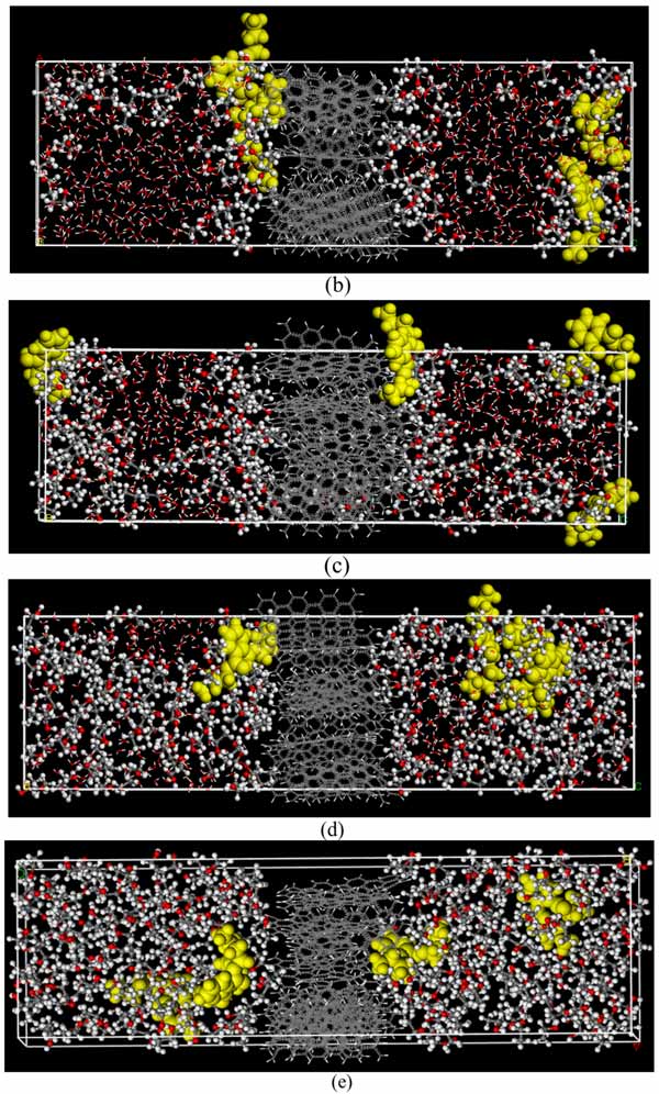圖3:不同乙醇含量溶液的模型快照:(a)0v%、(b)30v%、(c)50v%、(d)70v%、(e)100v%。