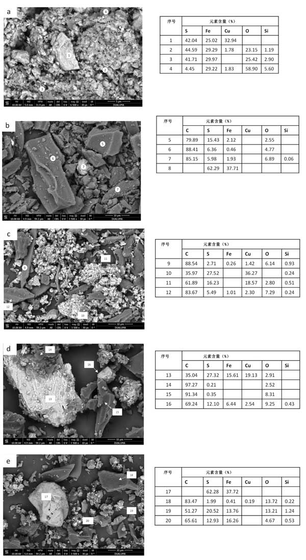 最終殘留物的SEM-EDS圖像在圖2顯示,并證實了通過XRD獲得的結(jié)果。圖2a顯示了礦物浸出后固體殘渣的SEM圖像。可以觀察到大的黃銅礦顆粒的存在(點1),黃鐵礦的小顆粒具有不同的氧化礦物(點2、3和4)。樣品活性炭浸出后的固體殘留物圖像(圖2b)顯示活性炭的存在,其表面具有硫原子和一些Fe(點5、6和7)和黃鐵礦(點8)。沒有觀察到銅的存在,這與其高提取值(99.1%)一致。圖2c顯示了樣品活性炭1:0.25浸出后獲得的固體殘留物的圖像。在活性炭的表面上可以觀察到硫和銅的存在,可能是由于CuS(點9-12)。用生物炭浸出礦物后的固體殘渣分析見圖2d(比例1:1)和(比例1:0.25)。根據(jù)XRD分析,有黃銅礦顆粒(點13)類似于沒有生物炭的礦物浸出的固體殘渣。與添加活性炭相比,生物炭顆粒的表面硫含量較低(點14和15),表明生物炭吸附能力較低,這與生物炭的較低表面積一致。生物炭表面上存在的一些硫可能是由于與浸出劑的反應(yīng)和硫物質(zhì)的低吸附性。最后,觀察到不同礦物的聚集體(第16點)。關(guān)于生物炭比例為1:0.25的固體殘留物,黃鐵礦的存在(第17點),生物炭與少量S、Cu和Fe結(jié)合(第18點),可以觀察到不同礦物和碳顆粒的小顆粒混合物(第19點和第20點)。