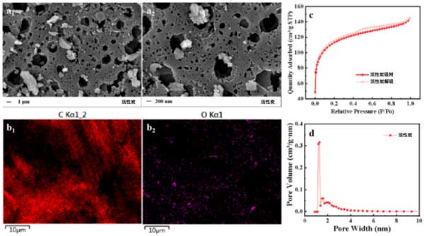 圖1:活性炭的SEM(a1,a2)、EDS(b1,b2)、N2吸附-脫附等溫線(c)和孔徑分布(d)圖像。