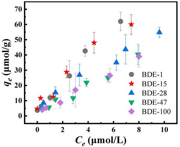 在實際污染場地,通常存在各種PBDEs,進一步研究了活性炭在洗脫液中對不同PBDEs的吸附特性;钚蕴繉Σ煌琍BDEs的吸附效果如圖2所示。結果表明,活性炭對五種PBDEs具有良好的吸附效果。隨著PBDEs中溴含量的增加,活性炭對PBDEs的吸附能力降低;這可能是因為低溴多溴二苯醚分子體積較小,更容易與吸附劑的吸附位點結合。綜上所述,活性炭對不同溴化度的PBDEs表現(xiàn)出良好的去除能力。