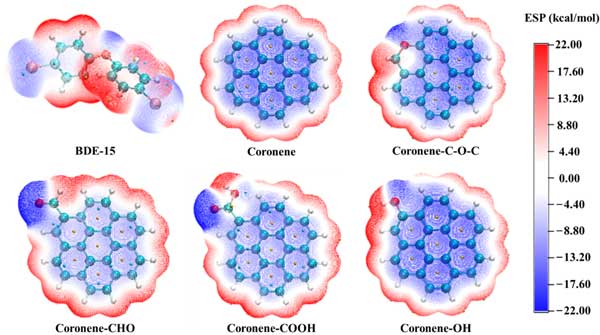 為進一步研究PBDEs與活性炭之間的微觀相互作用機制,通過計算化學研究了活性炭結構模型與BDE-15之間的弱相互作用。根據表征結果,構建了以暈苯為基本結構的純碳結構模型,以及羧基、羥基、醛和醚取代的結構模型,模擬了活性炭的不飽和碳結構和含氧官能團結構。BDE-15和五種活性炭結構模型的靜電勢如圖5所示。BDE-15在其溴原子和氧原子附近顯示出負靜電勢,而在其他區(qū)域,尤其是在其氫原子附近,則顯示出正靜電勢。這是因為溴原子和氧原子的電負性大于碳原子,而氫原子的電負性最小。在Coronene的結構中,所有的碳原子都表現(xiàn)出負的靜電勢特征,而氫原子則表現(xiàn)出正的靜電勢特征。含氧官能團的引入增加了基團附近的正靜電勢面積和負靜電勢面積,屬于結構中極性最強的區(qū)域。根據正負靜電勢相互吸引的原理,BDE-15和活性炭結構模型可以形成多種復合構型?梢酝茰y,基團附近存在強靜電勢區(qū)使得BDE-15更容易與基團結合。