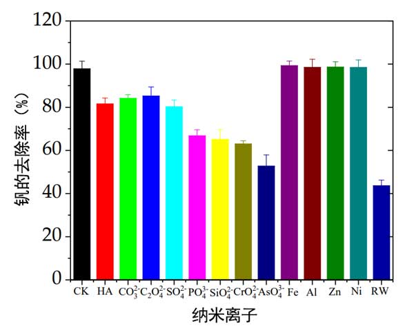 圖2:共存離子對活性炭載納米零價鐵去除釩的影響。