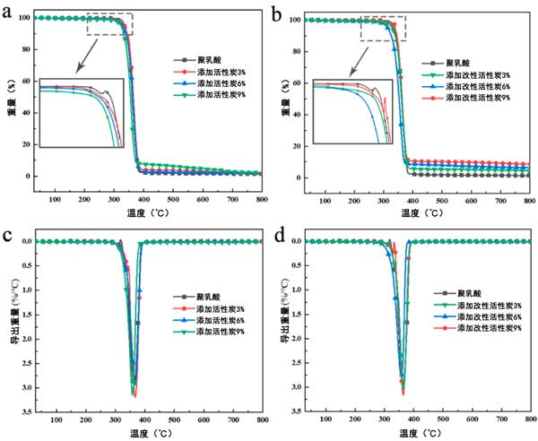 熱重分析結果列于圖3中。所有樣品均呈現(xiàn)單一熱降解階段,但5%質(zhì)量損失溫度(T5%)或熱降解速率最高溫度(Tmax)略有不同。純聚乳酸在322℃時開始快速降解,如圖3a所示,其Tmax達到363℃,并且在400℃時幾乎所有質(zhì)量都損失了。在800℃的終端溫度下測得相應的殘?zhí)柯蕛H為1.35%。相比之下,當應用改性活性炭時,酸性添加劑(磷酸鹽)會促進聚乳酸復合材料的較早分解,這與之前的結果一致。殘?zhí)柯孰S著復合材料中改性活性炭的加載而逐漸增加。純聚乳酸和改性活性炭復合材料的Tmax幾乎沒有差異,分別為363℃、364℃、357℃和363℃。因此可以看出,改性活性炭負載對聚乳酸降解沒有影響。在600℃到800℃的范圍內(nèi),聚乳酸燃燒的殘余物沒有質(zhì)量變化,但在一定程度上可以觀察到輕微的質(zhì)量損失,表明加入改性活性炭后復合材料的燃燒延遲。