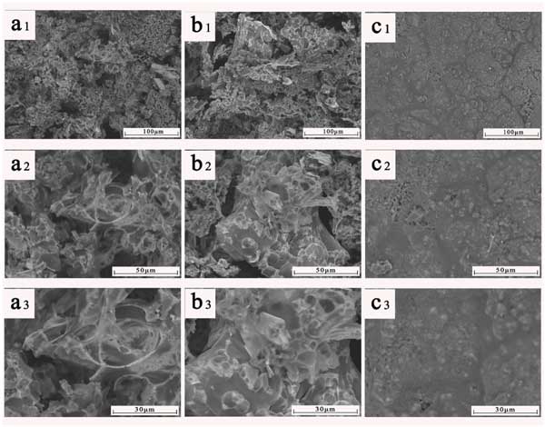 當加載足夠的改性活性炭時,膨脹的殘余碳可以通過其質(zhì)量、連續(xù)性和致密性得到證實,這些都得到了極大的改善。一般來說,膨脹的殘余碳可以減少凝相和氣相之間潛在的熱和傳質(zhì),這反過來又會引起燃燒抑制。經(jīng)過錐形量熱儀測試后如圖4中的圖案所示,可以注意到殘留碳的顯著形態(tài)差異。在改性活性炭6%和改性活性炭9%的表面上可以看到空隙和裂口(圖4a1、b1),它們可以作為熱量的擴散途徑,并且在燃燒過程中會揮發(fā)。此外,相比之下,改性活性炭9%在表面提供了精細的皺紋覆蓋層(圖4c1),這產(chǎn)生了有效的凝聚相阻燃性,此外,皺紋形態(tài)可以作為復合材料的增強框架。