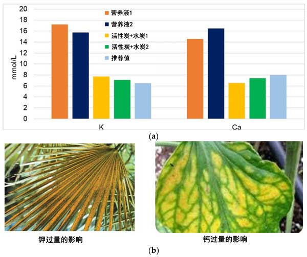 圖2:(a)通過活性炭和水炭處理將較高濃度的Ca和K降低到安全的可回收水平。(b)過量的鉀和鈣對(duì)植物生長(zhǎng)的影響。