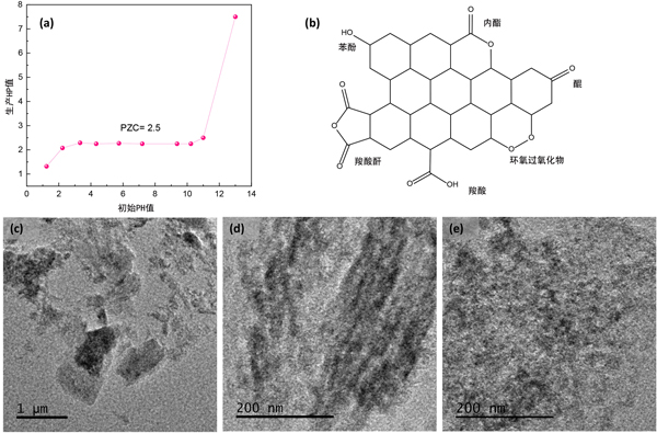 圖1:活性炭載體的研究:(a)零電荷點(diǎn)(PZC)的測定:反應(yīng)24小時(shí)后所得pH值作為起始pH值的函數(shù)。(b)不同含氧基團(tuán)。