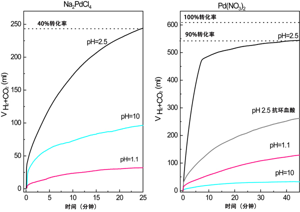 兩種不同的Pd前驅(qū)體在不同浸漬pH下制備的活性炭催化劑在60℃時(shí)產(chǎn)生的重整氣體(H2+CO2)的體積隨時(shí)間的變化曲線圖在圖2顯示。由于甲酸鈉添加劑對甲酸脫氫的促進(jìn)作用,催化測試在存在的情況下進(jìn)行]。所有制備的樣品都顯示出研究反應(yīng)的活性。正如在當(dāng)前測試條件下所預(yù)期的,曲線的形狀遵循甲酸中的一級(jí)動(dòng)力學(xué)。為了更好地理解析氫曲線,我們測量了不同階段的反應(yīng)pH值:分散催化劑和甲酸鈉在60℃攪拌30分鐘后,注入甲酸后,當(dāng)反應(yīng)開始時(shí)和使用Na2PdCl4制備的催化劑系列反應(yīng)25分鐘后和Pd(NO3)2系列反應(yīng)40分鐘后,根據(jù)圖7所示的曲線。表明在所有樣品的反應(yīng)過程中,甲酸+甲酸鈉緩沖液的初始pH值保持不變,除了使用Pd(NO3)2制備的樣品,在pH值2.5下浸漬并用銻還原。對于該樣品,反應(yīng)40分鐘后的pH值為8.2,表明緩沖條件的喪失和甲酸的總消耗量與實(shí)現(xiàn)的90%甲酸轉(zhuǎn)化率一致。對于該系列的其余部分,pH測量值表明甲酸并未完全消耗,這與實(shí)現(xiàn)的轉(zhuǎn)化率一致。