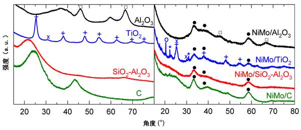 本工作的目的是研究HDO/HDS催化劑失活的第一種方法,即載體的結(jié)構(gòu)和質(zhì)地變化。選擇高表面積和介孔的Al2O3、TiO2、SiO2-Al2O3載體來沉積NiMo硫化物,用于辛酸加氫脫氧和1-苯并噻吩HDS在1.6MPa和330℃下的平行反應(yīng)。中孔的高表面積應(yīng)該能夠分散NiMo相的高負載量。這些中孔載體的薄壁應(yīng)該對H2O和/或酸性CO2/H2的破壞更敏感催化劑前體和HDO/HDS還原硫化過程中的O混合物。由于其惰性和高HDO/HDS活性,已選擇活性炭進行比較。因此,我們分別使用XRD和氮氣物理吸附闡明了HDO/HDS后載體、硫化物催化劑和硫化物催化劑的結(jié)構(gòu)和質(zhì)地特性。