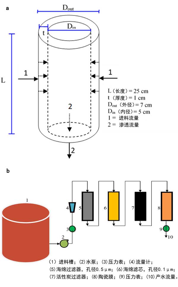 圖2:(a)陶瓷膜的示意圖,(b)水處理工藝流程示意圖。