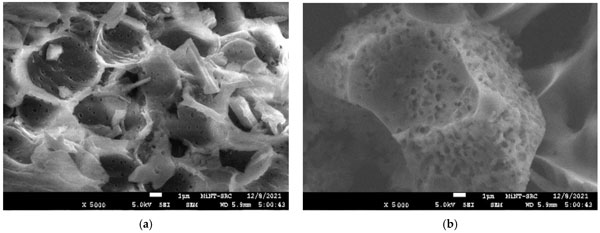 使用FESEM分析觀察了活性炭產品的浸漬和碳化溫度影響的形態(tài)變化。圖1a、b描繪了木質素在被激活之前的表面形態(tài)。它顯示出厚而平坦的圖案,中間有小裂縫。這歸因于大量的木質素,一種酚類聚合物,賦予植物結構強度,使其具有堅硬粗糙的木材狀結構。在圖1b中,發(fā)現(xiàn)前體具有壓實的表面,上面有淺而堵塞的孔隙圖案。這可能是由于烘箱干燥過程中預處理和加熱過程的反應。從圖1a、b,由于無孔表面的存在,表面清楚地顯示為不令人滿意的吸附材料。