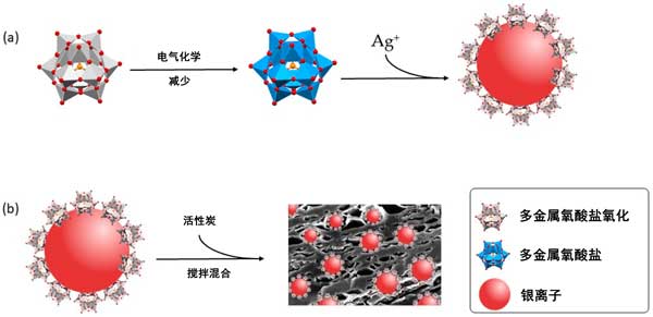 圖1:(a)多金屬氧酸鹽納米銀的合成示意圖,其中多金屬氧酸鹽同時充當(dāng)還原劑和穩(wěn)定劑,(b)三組分多金屬氧酸鹽納米銀雜化材料的制備過程。不在規(guī)模上,多金屬氧酸鹽的大小為1nm,納米銀的大小約為27-43nm,具體取決于初始試劑濃度。