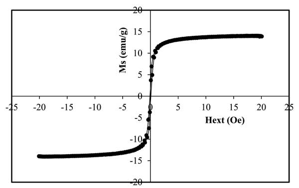 復(fù)合磁性材料的磁性測量顯示出室溫下的超順磁性。圖2顯示了在24.8℃溫度下測量的活性炭磁鐵礦材料的磁滯回線的存在。磁性活性炭的飽和磁化強(qiáng)度(Ms)值為14.06emu/g。磁性復(fù)合材料合成通常會(huì)降低純磁性材料的飽和磁化強(qiáng)度(Ms)值。