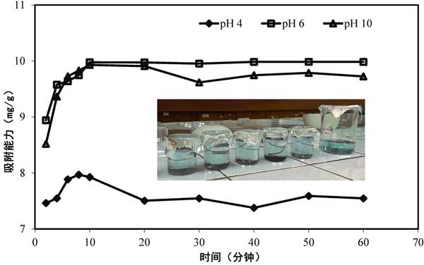 圖3:使用1.0g磁性活性炭吸附50mLFe(II)100ppm,并在28℃下改變吸附時(shí)間和pH值。