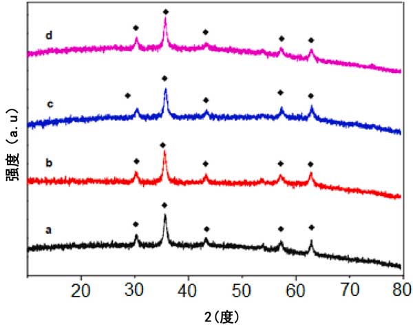 圖4:活性炭磁鐵礦復(fù)合材料的X射線衍射圖(a)磁性活性炭吸附前、吸附后(b)pH4、(c)pH6和(d)pH10。