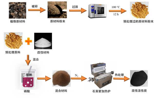 改性活性炭的合成在圖1顯示。將5.0g的原材料粉末與不同量的Na2EDTA(0、10、15和20mmol)混合,然后在磷酸中浸泡一段時(shí)間。將樣品加熱到一定溫度(分別為500℃、600℃和700℃)。升溫速率為5℃/分鐘。當(dāng)溫度達(dá)到目標(biāo)值時(shí),將樣品在N2中保持1小時(shí),然后冷卻至室溫。隨后,用去離子水沖洗樣品,直至達(dá)到穩(wěn)定的pH值,然后在90℃的真空烘箱中干燥過(guò)夜,最后細(xì)磨成小于100目的顆粒。此過(guò)程得到Na2EDTA改性的活性炭。