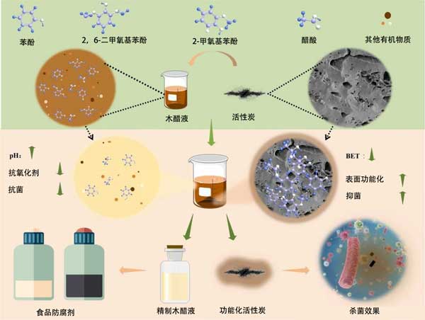 當用活性炭處理木醋液時,活性炭會吸附焦油、酚和其他有害有機化合物等雜質。這一凈化過程提高了木醋液的質量,使其更適合各種用途。
