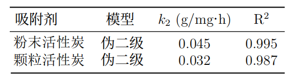 吸附過程符合偽二級動力學(xué)模型(R2>0.99),表明化學(xué)吸附為主導(dǎo)機(jī)制。吸附速率常數(shù)k2隨粒徑減小而增加,反映了粉末活性炭的快速吸附特性(圖2)。