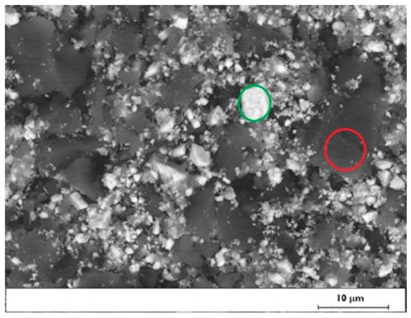 圖1:活性炭混合物顆粒的SEM圖像(綠色圓圈對(duì)應(yīng)重晶石顆粒,紅色圓圈對(duì)應(yīng)活性炭顆粒)。