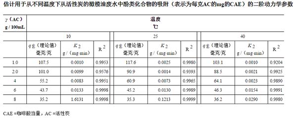 橄欖油廢水中酚類化合物處理由大多都由活性炭來吸附,本期帶大家了解活性炭的吸附劑量和溫度的影響。在最佳條件下(每100毫升8克活性炭),每克活性炭表示當量mg的活性炭的最大吸附容量為10.8℃時為35.8℃,25℃為35.4℃,40℃時為36.1℃ C。偽二階模型被認為是最適合于動力學(xué)結(jié)果,并且選擇Langmuir等溫線來更好地描述吸附系統(tǒng)。結(jié)果證實了活性炭從橄欖油流出物中幾乎除去所有酚類化合物部分的效率。