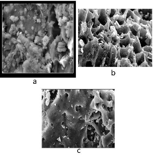圖1、(a)碳的SEM(b)活性炭的SEM(c)MFT/活性炭的SEM。